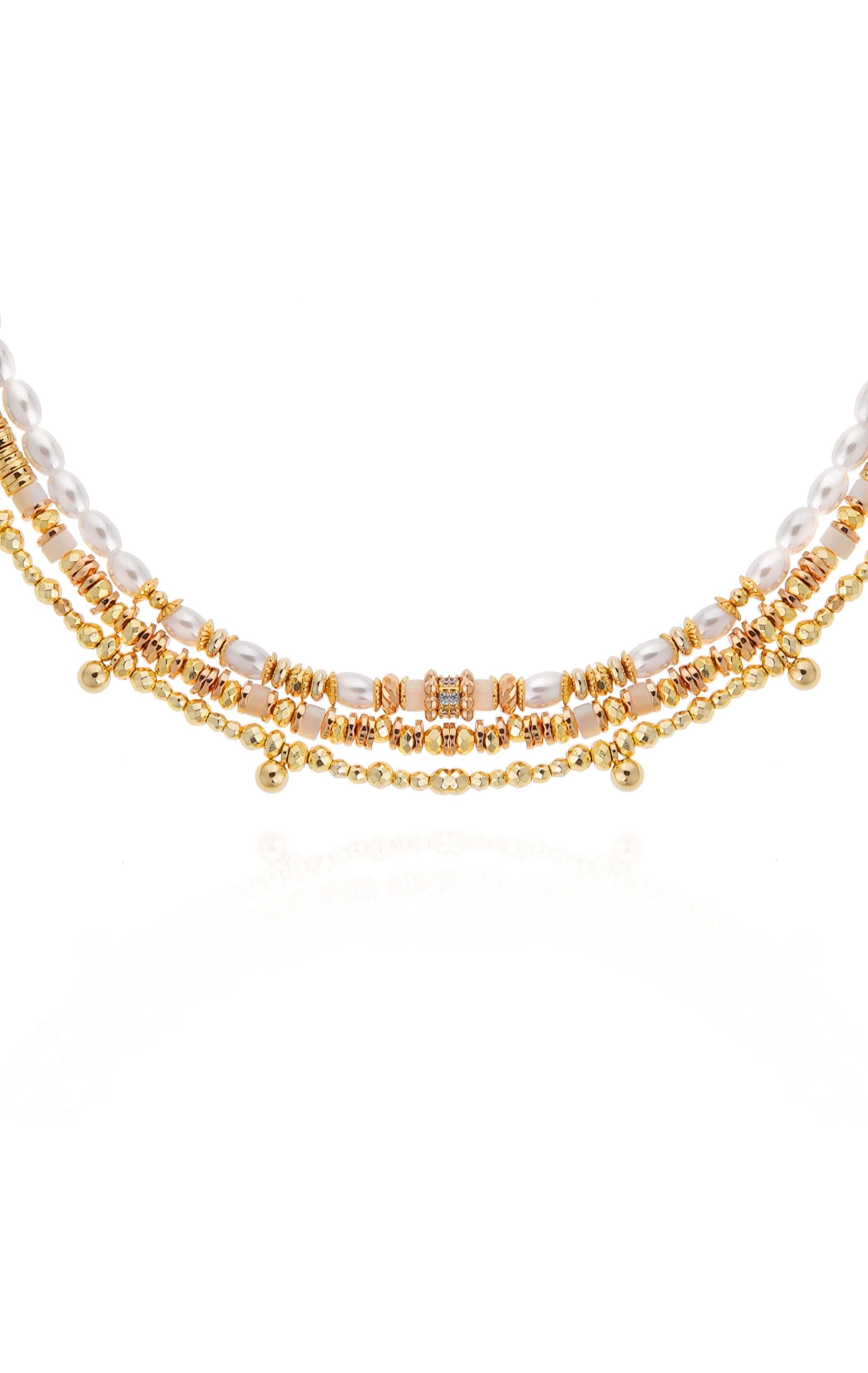 Our gold Trion necklace is a magnificent gold-plated necklace featuring three links of pearly white shell pearls, accented with gold rondelles and flat pearls. Match it with the Vadorada bracelet for a harmonious sparkle, or mix it with one or more of its seven other color variations.