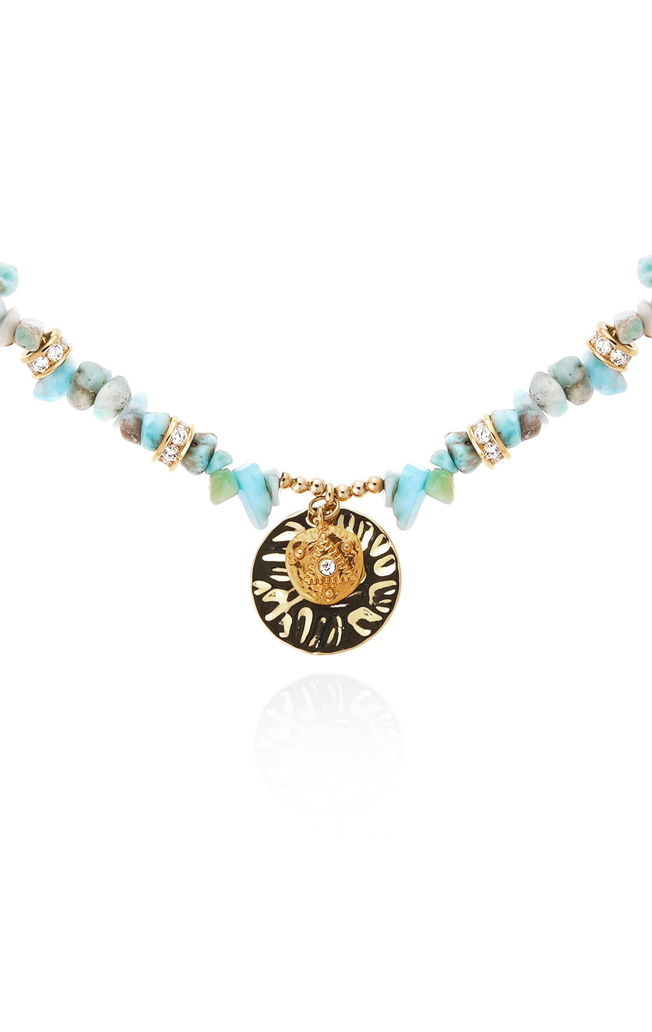 Victor is an adorable necklace composed of amazonite stones accumulated on a link adorned at its center with two superimposed pendants: a medal with a protective rhinestone eye and an exquisite gold-plated pendant with beautifully rounded corners.
