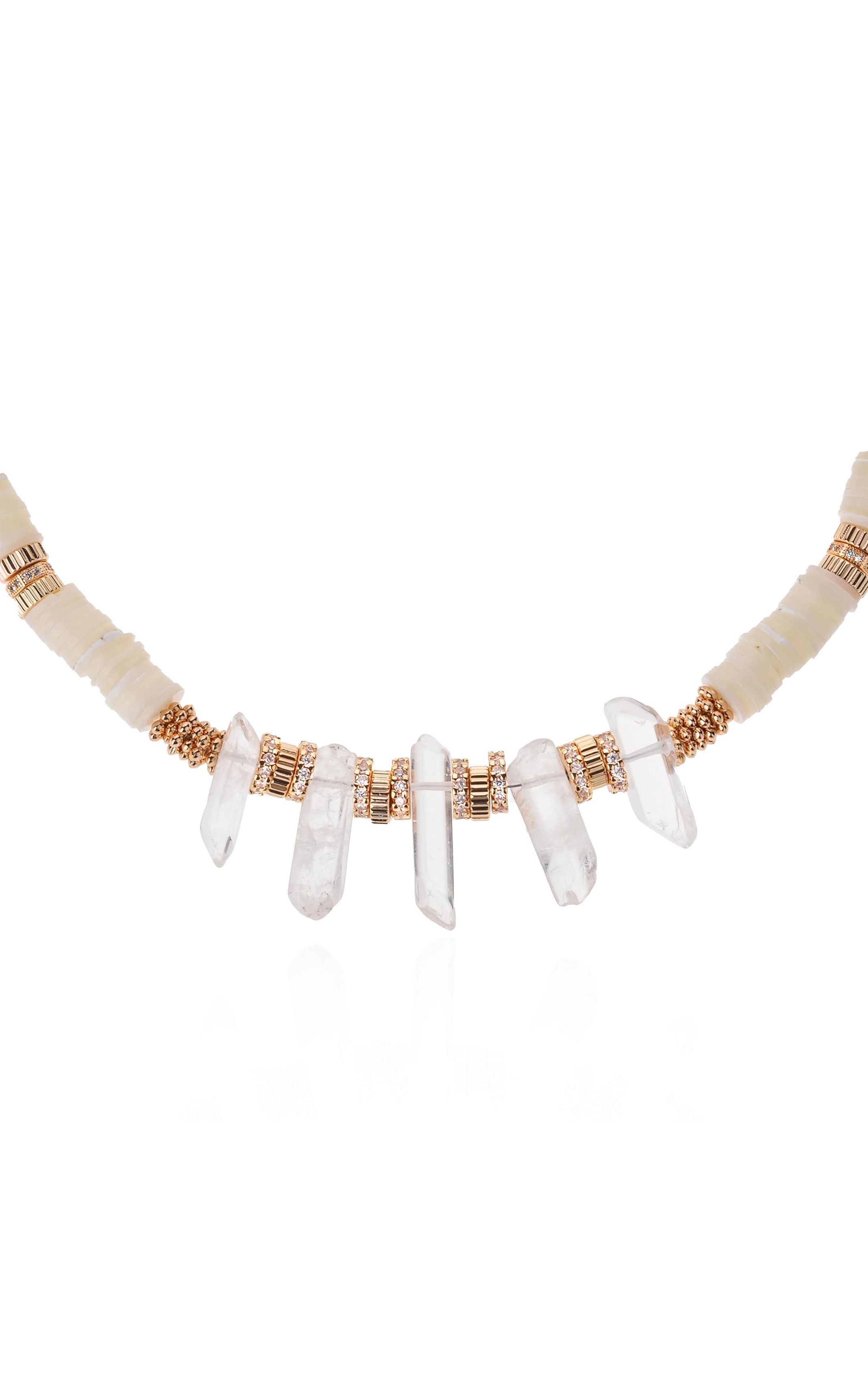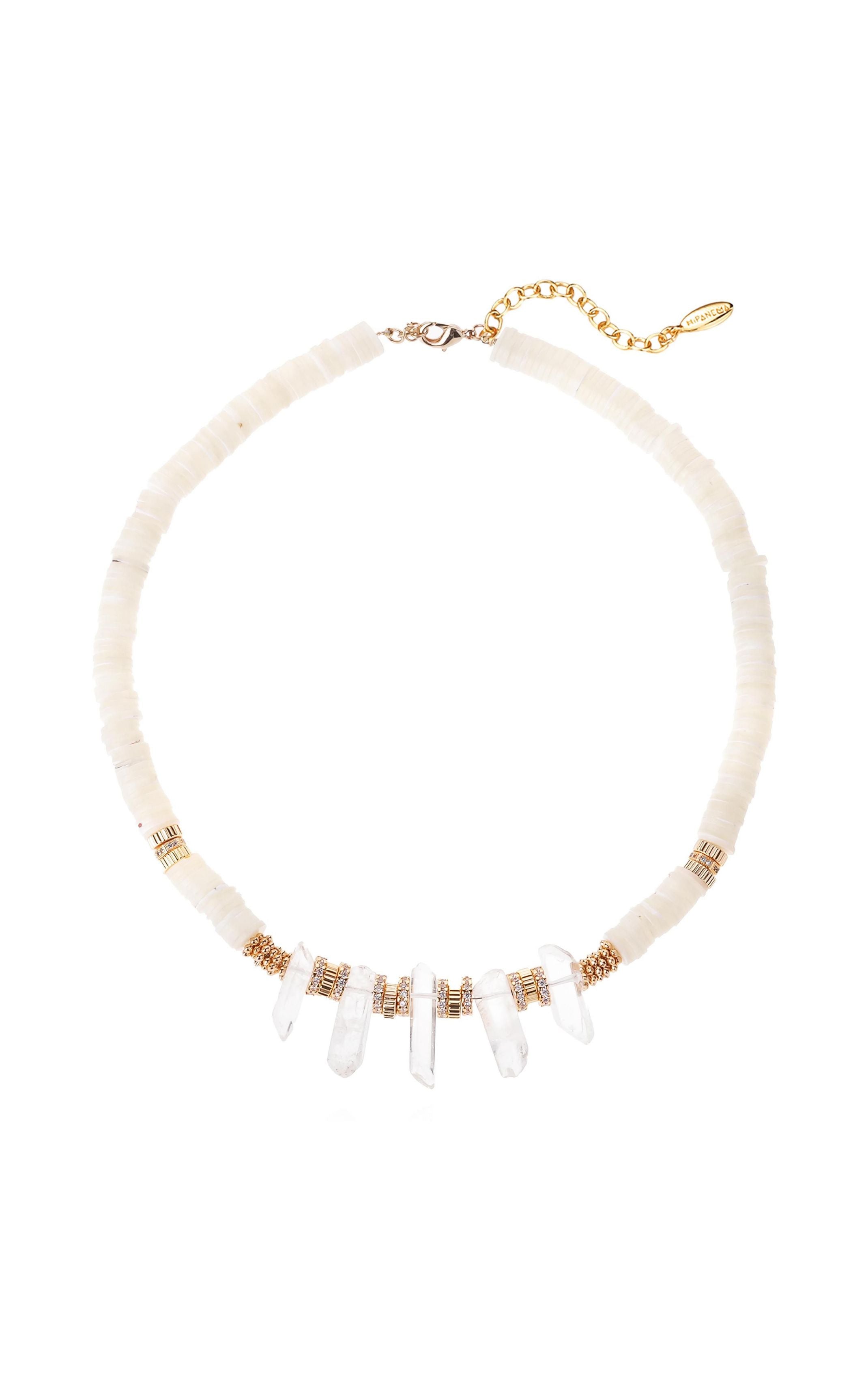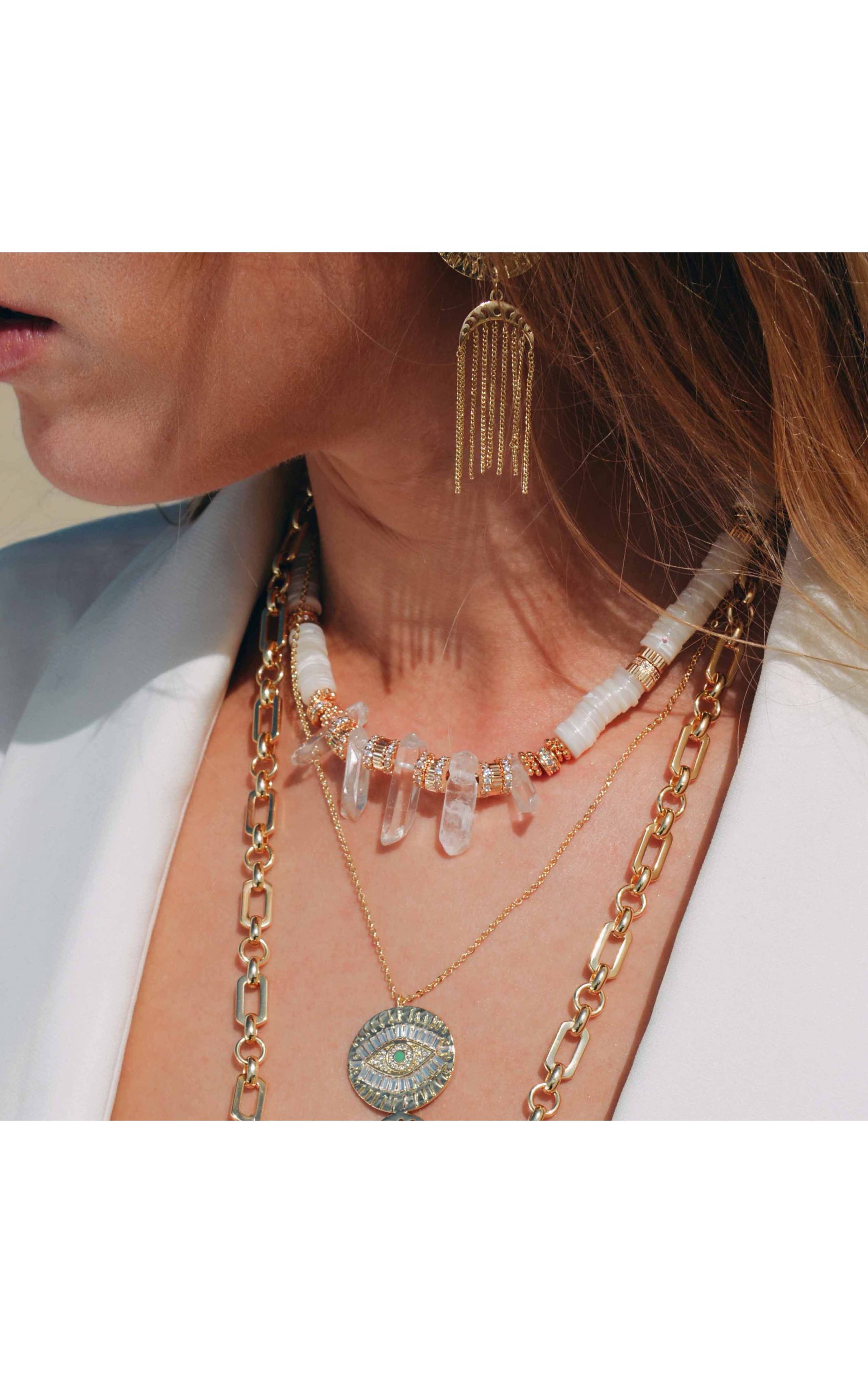 Whitewashed houses, bright and immaculate, with a breathtaking view of the horizon and the glistening sea, struck by the ever-present sun. This is what our Coral Coast theme evokes, among other things. A choker necklace, gilded in fine gold, Oscar is adorned with fine white shell rondelles punctuated by striated and rhinestone rondelles and adorned at its center with stretched, angular stones evoking majestic crystals. Instant sublimation for a sunny décolleté!