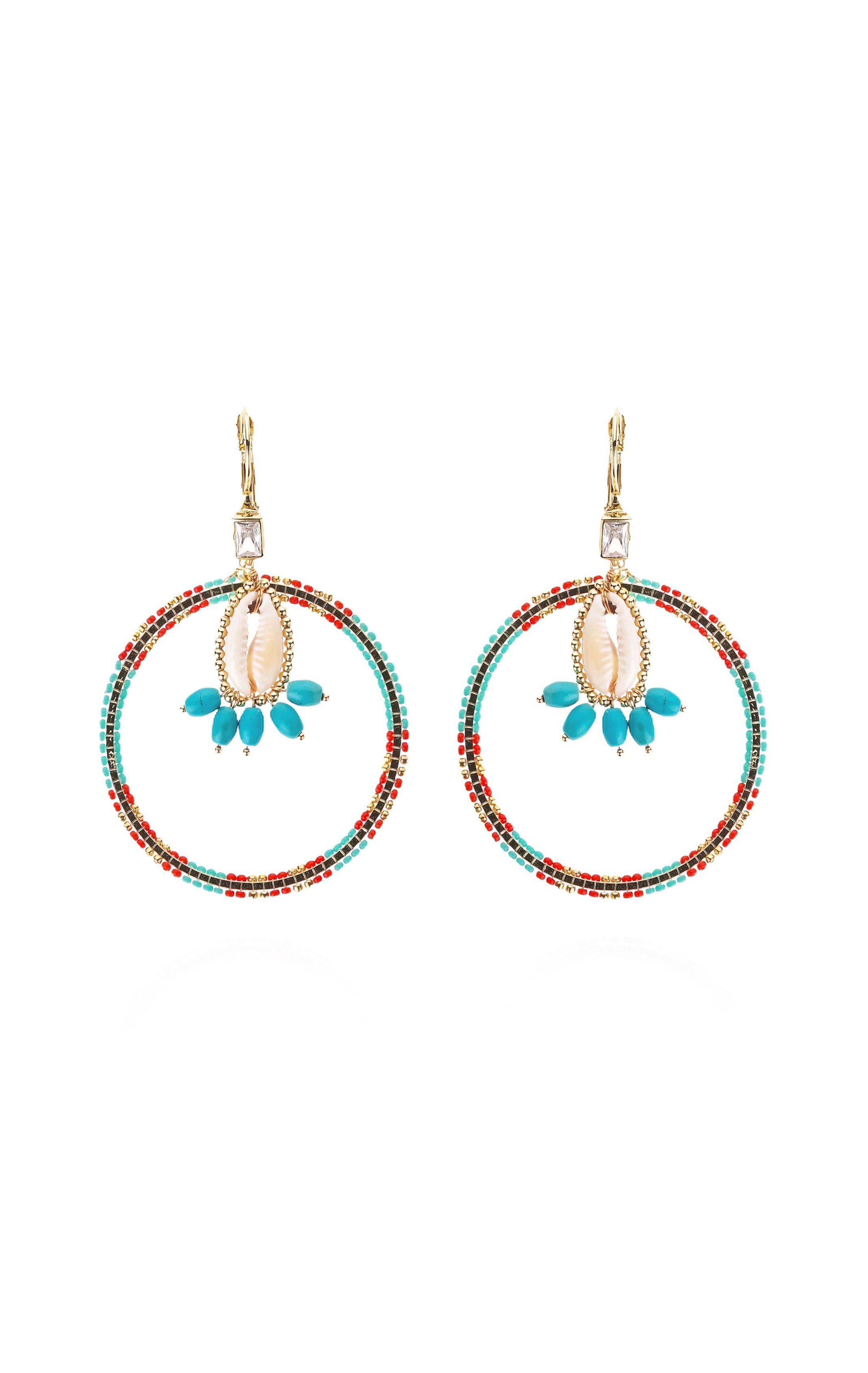 Recif is a gold-plated creole that marries elements with panache: a cabochon set on a cori encircled by small gold balls forms the upper part of the buckle, while a double ring beaded with coral and turquoise completes and perfects this sleeper-mounted buckle.