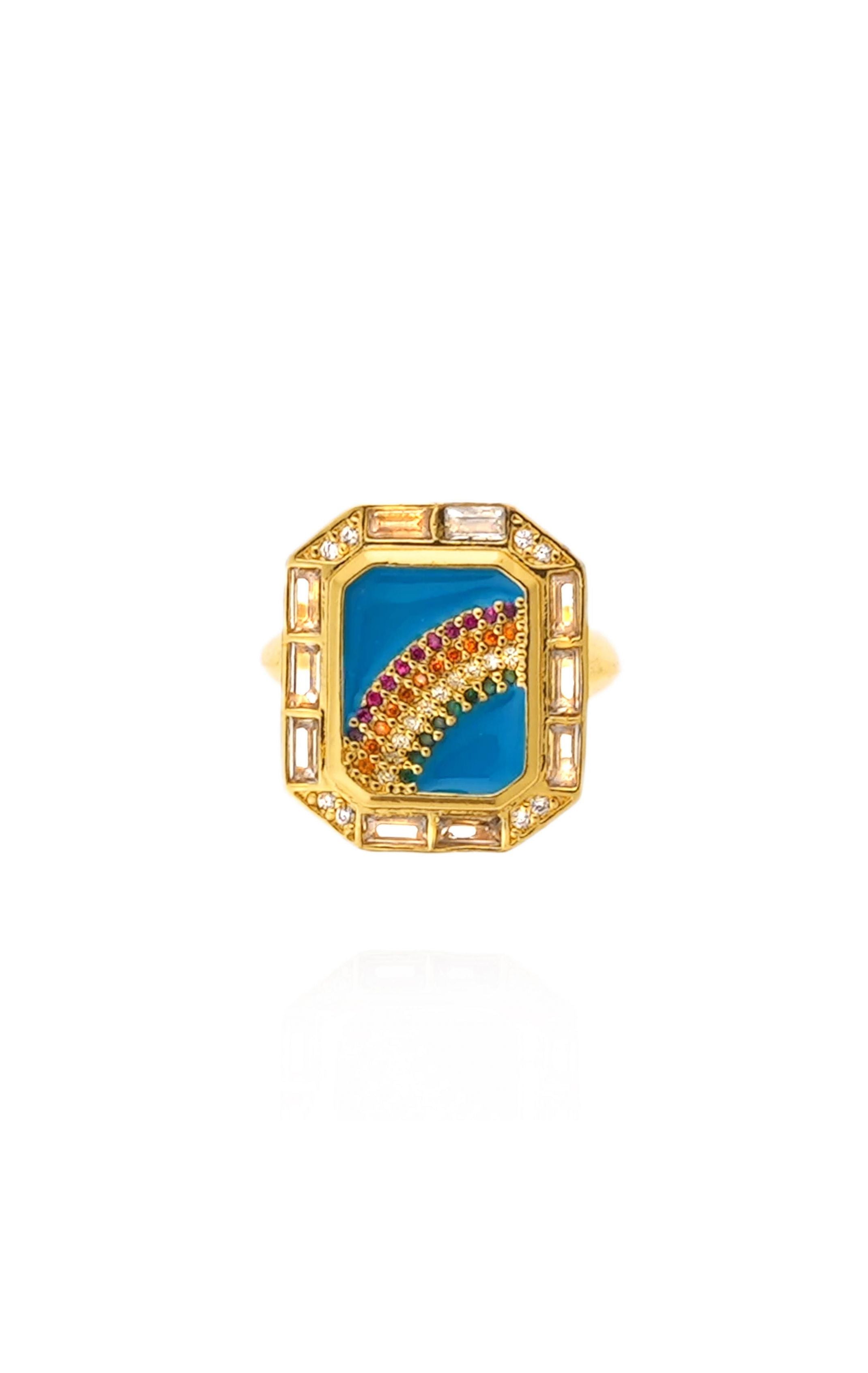 Our latest summer theme, Brazil, evokes a joyful, colorful and precious summer that we want to remember. The Bruna ring, gilded in fine gold and entirely handcrafted, is adorned with a strassed, emblematic elegance thanks to its square turquoise-enameled medal set with sumptuous faceted cabochons and featuring a rainbow of multicolored rhinestones. With its colorful, ostentatious sophistication, the Bruna ring will adorn your hands with all its brilliance. It comes in three colors and is adjustable for optimum comfort.
