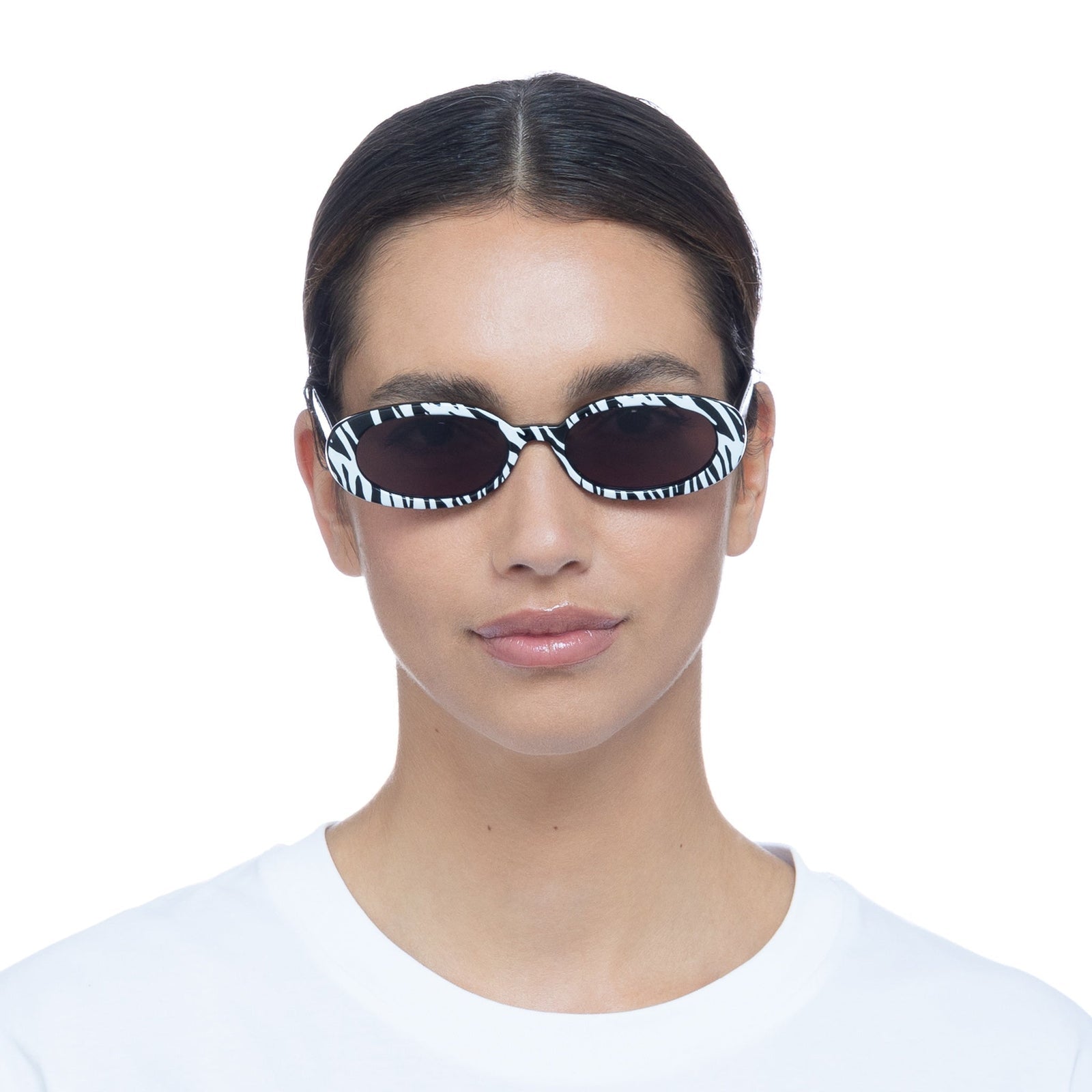Finished in a black and white tiger print with dark brown lenses for a statement look.