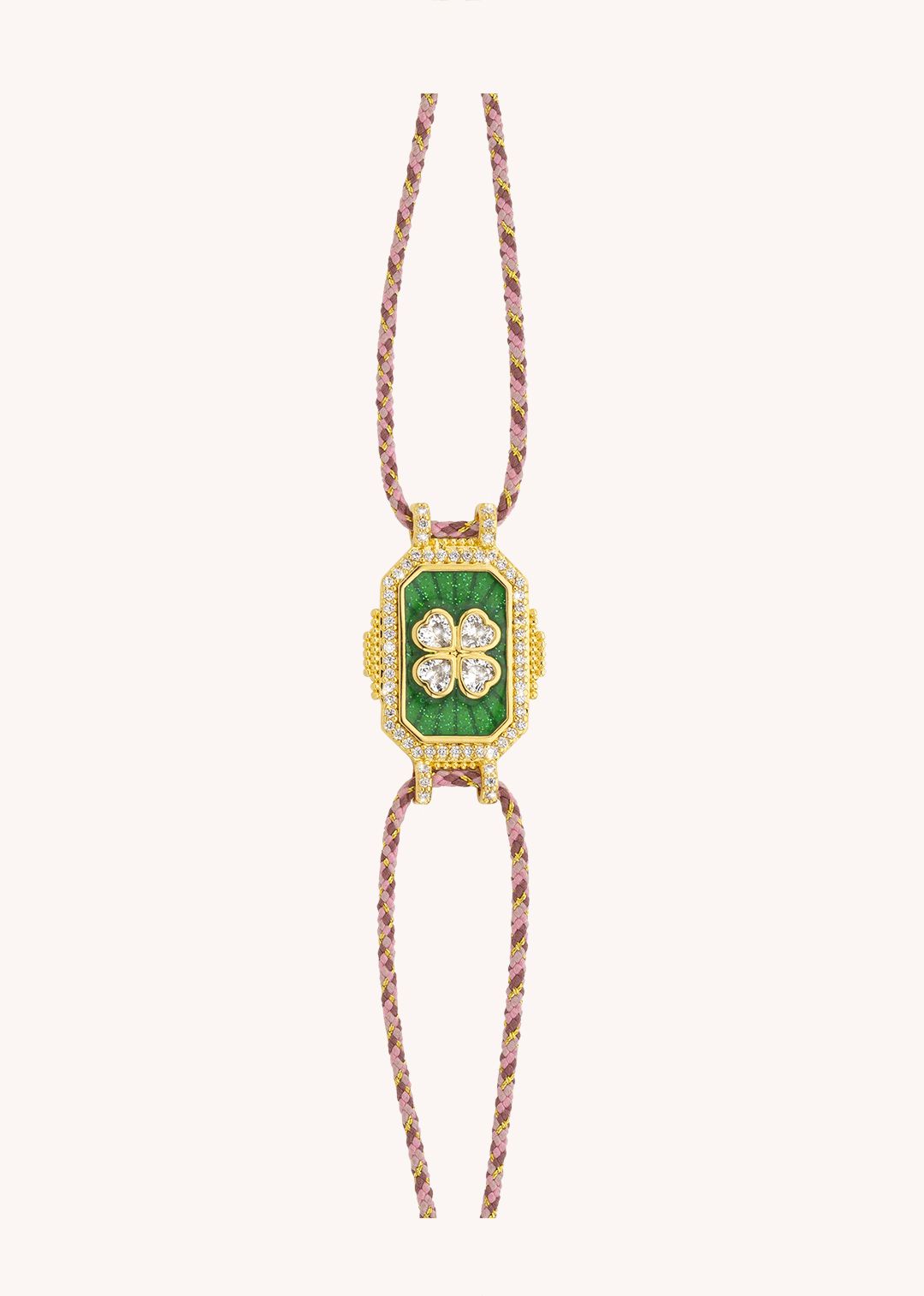 Each model combines a glittery fuchsia or green enamel plate, adorned with a central clover and surrounded by fine stones.