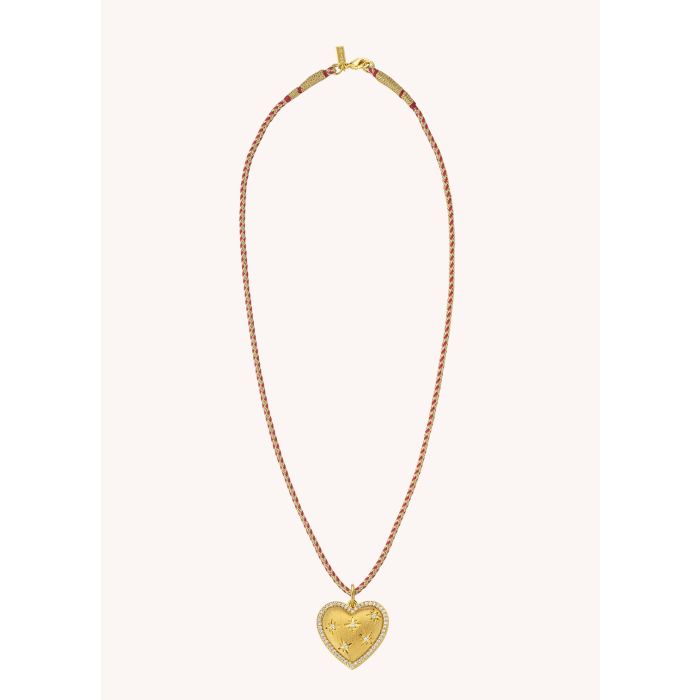 The BIG HEART necklace by MYA-BAY is gilded with recycled 24-carat fine gold. Mounted on a colorful cord, it features a domed heart pendant with a brushed finish, framed by sparkling white rhinestones. At 46 cm long, it makes a bold yet tender statement. A heart that speaks volumes — to wear close to yours. Also available in a playful version with fuchsia rhinestones: check out the BIG FUN HEART for a more pop take on the same silhouette.