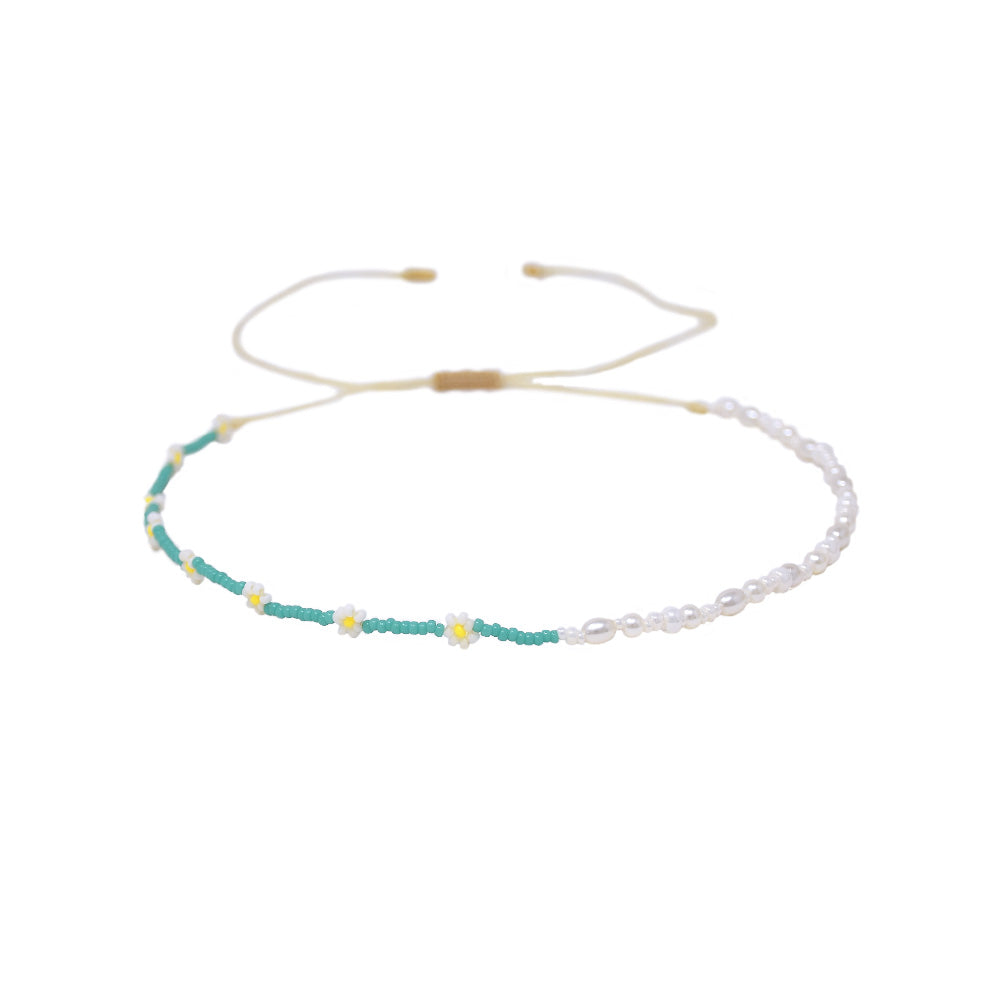 Glass japanese beads, polyester thread, synthetic pearl, Mishky gold plated logo