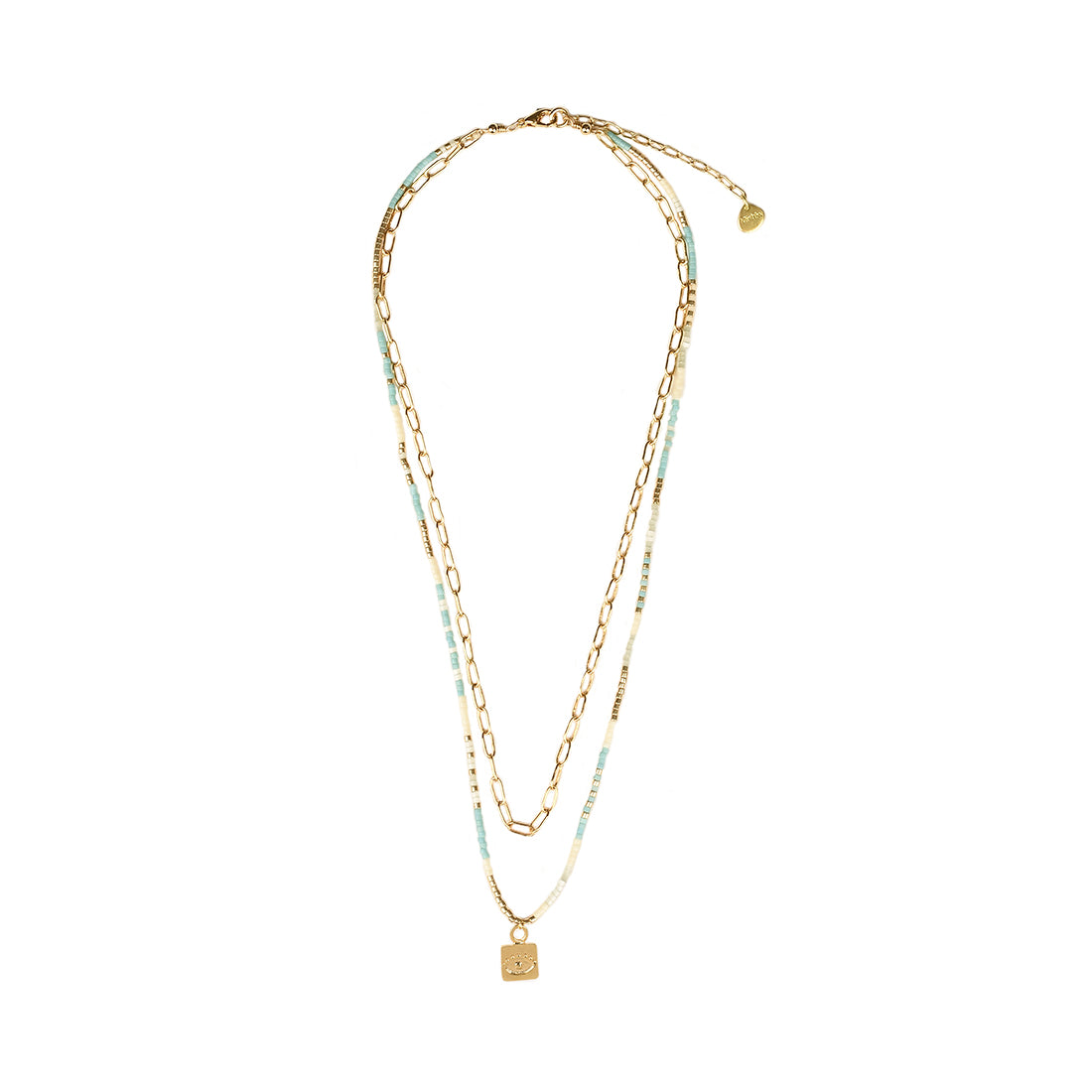 Japanese beads, polyester thread, bronze gold plated chain, bronze gold plated stender, bronze gold plated lobster clasp, bronze gold plated eye charm, Mishky bronze gold plated logo
