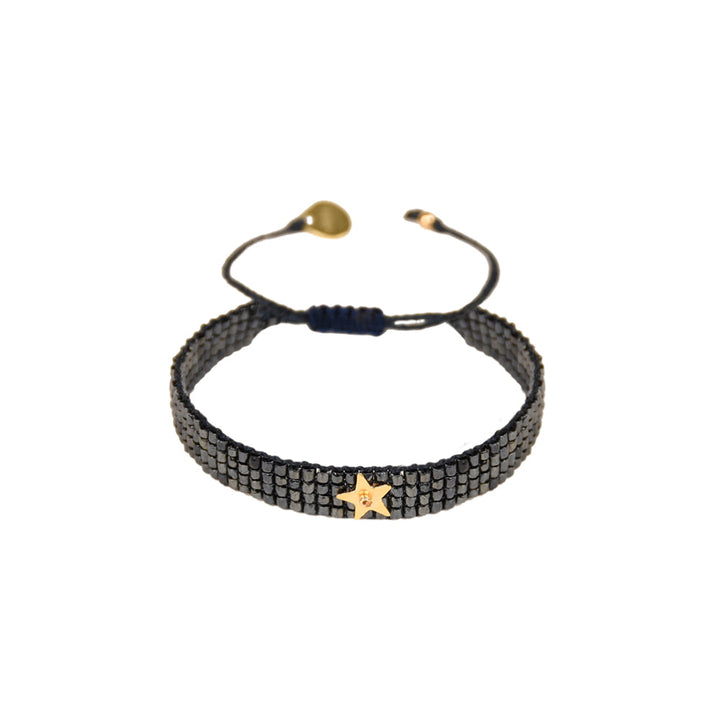 Round glass beads, polyester thread, gold plated star charm, bronze gold plated Mishky logo