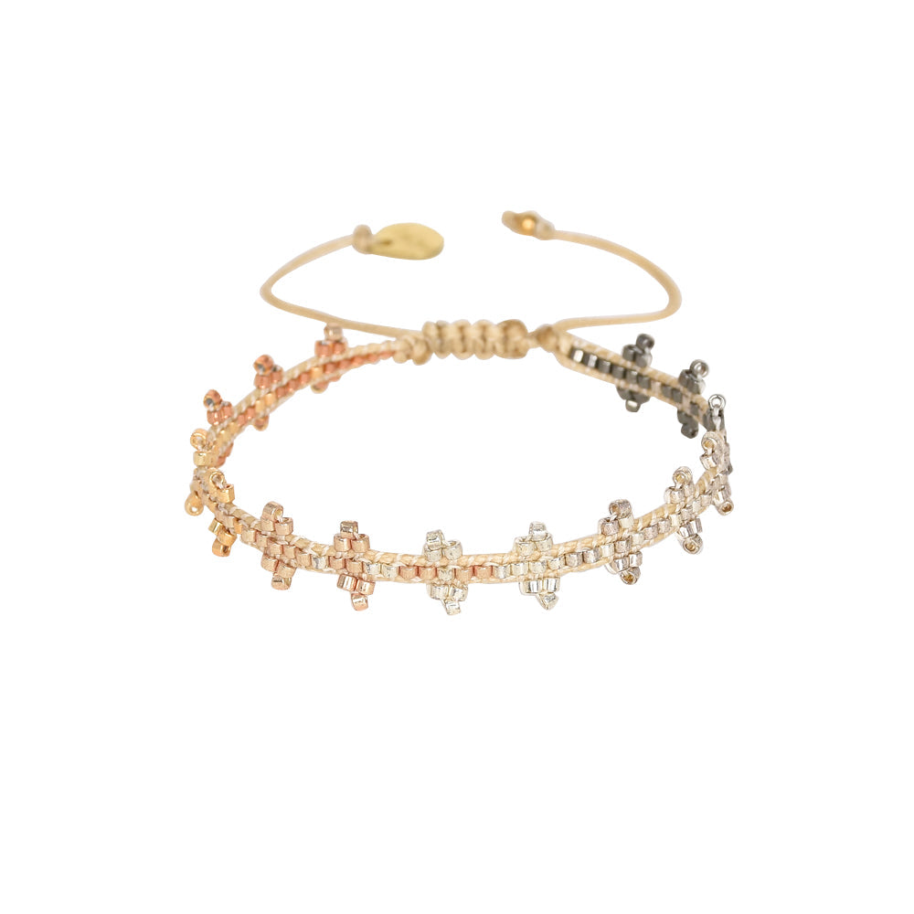 Japanese beads, polyester thread, italian thread, bronze gold plated Mishky logo