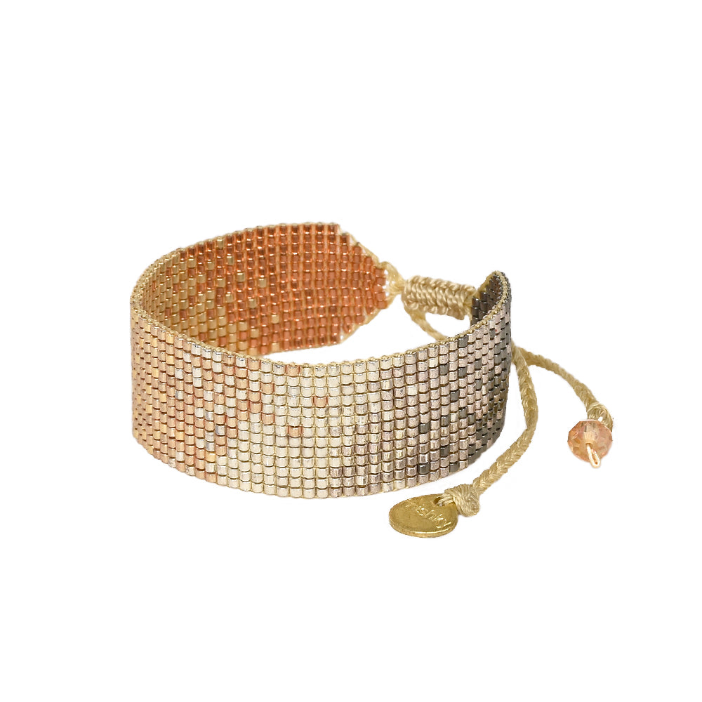 Japanese beads, polyester thread, terlenka thread, bronze gold plated Mishky logo