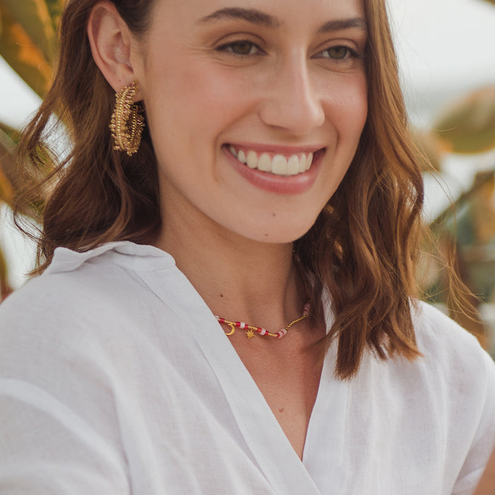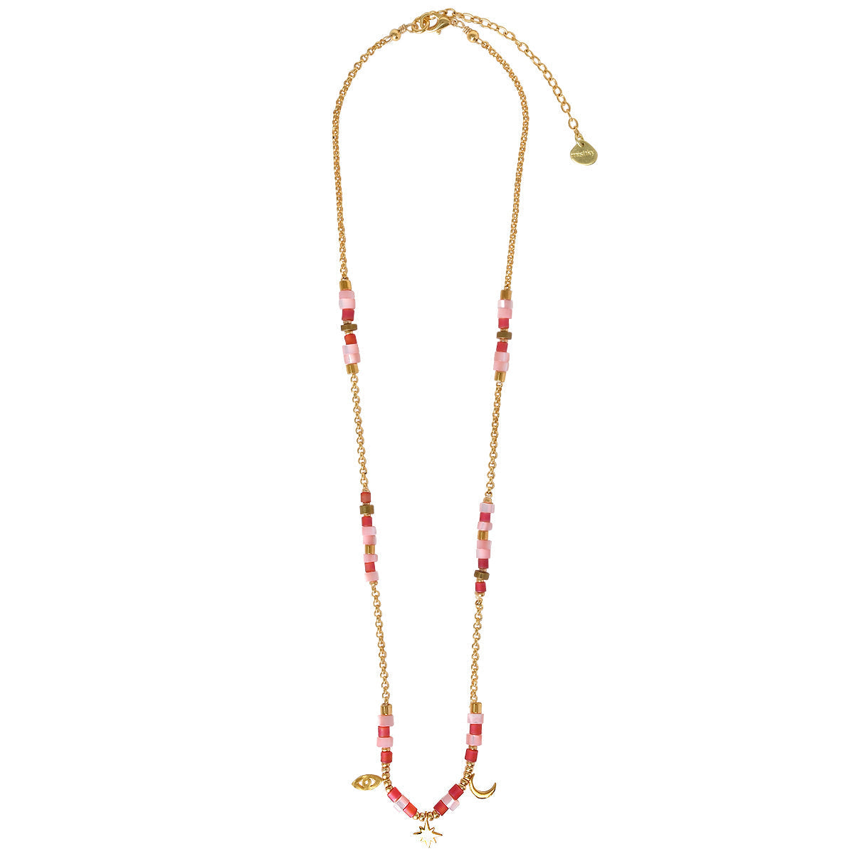 Celestial charm on your neck. This thin beaded adjustable necklace features 18K gold-plated chain and celestial charms for a playful touch.