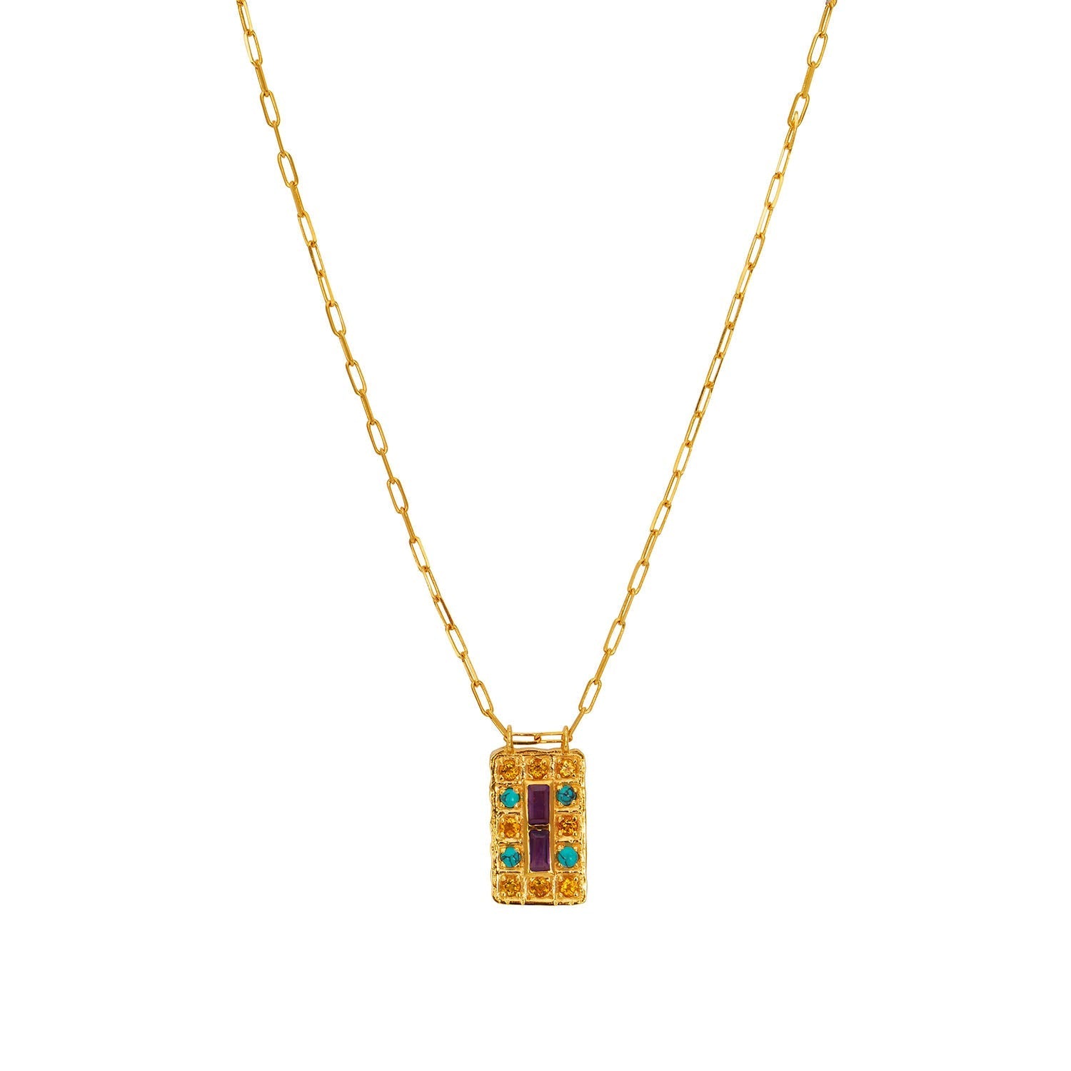 necklace bolivia amethyste, in brass base gilded with 1 micron 18 carat fine gold with a small plate decorated with a ruby ??cabochon, mini amethyste and citrine zircons on the top and small charms on the bottom.