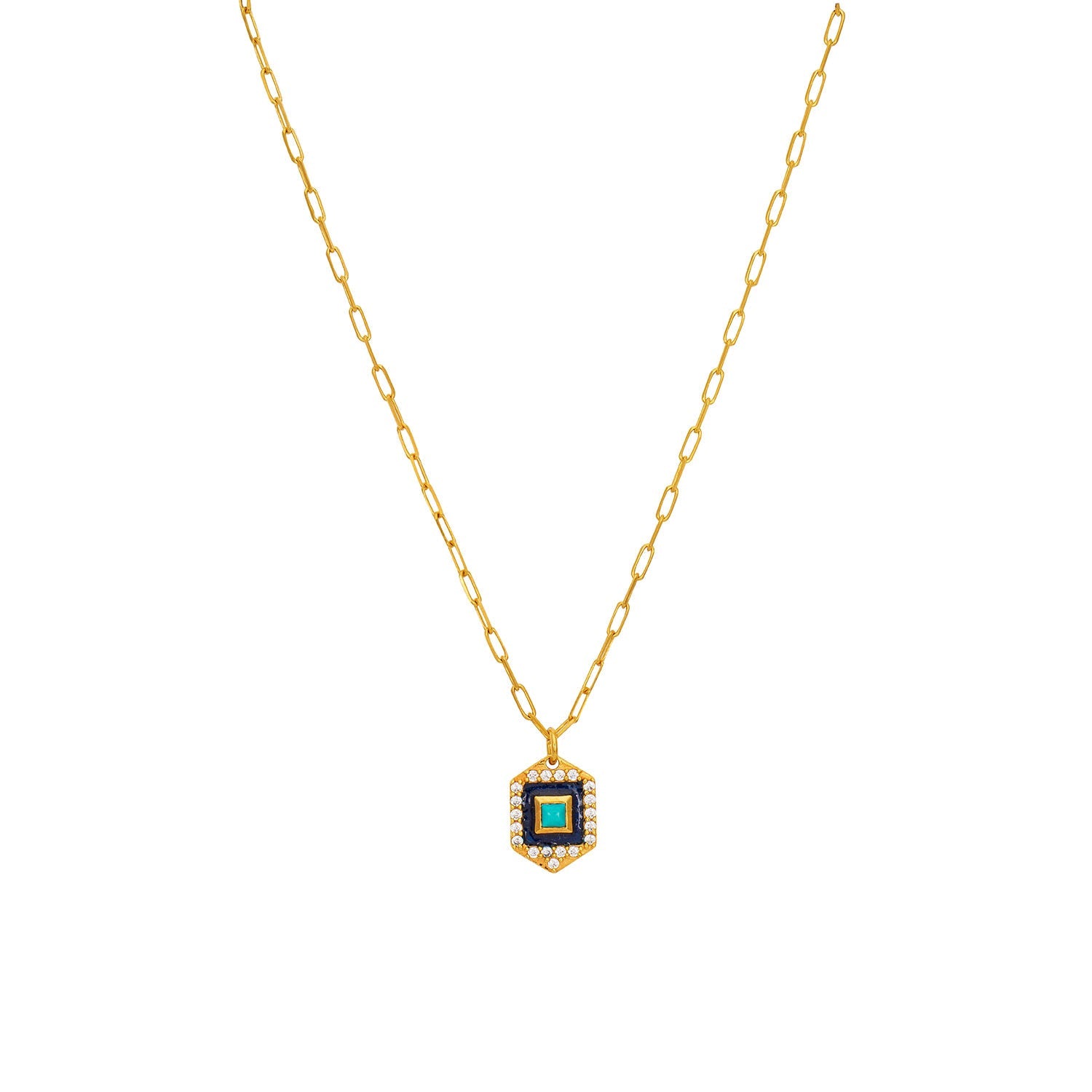 Blue gatsby necklace, a ball chain in brass base gilded with fine 18 carat gold 1 micron. A transparent rock crystal pendant in which we have inserted small shards of moonstone stones.