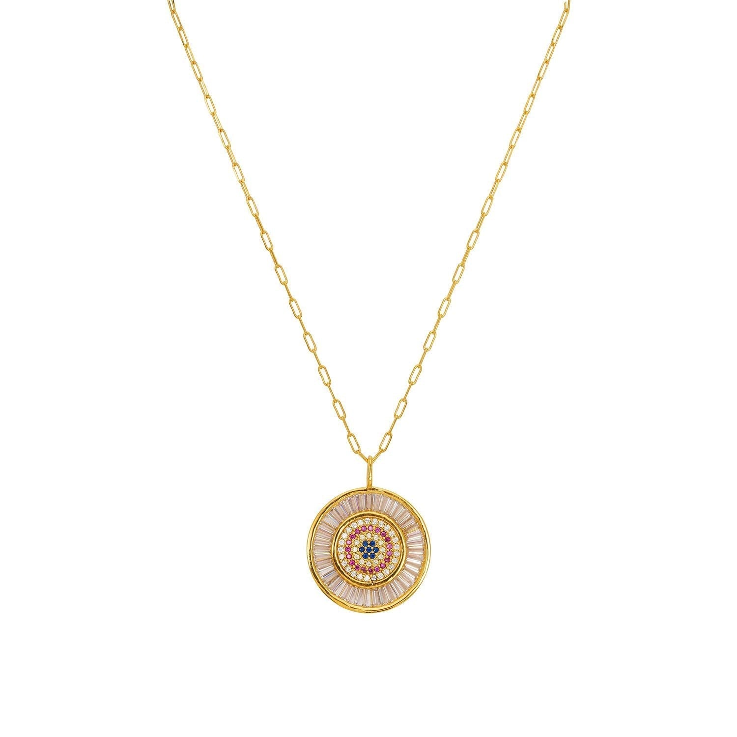Rosas necklace, a cable chain necklace in brass base gilded with 1 micron 18 carat fine gold and a medal with white crystal rods and colored zirconia.