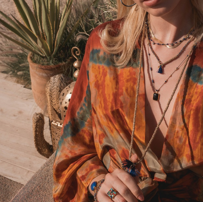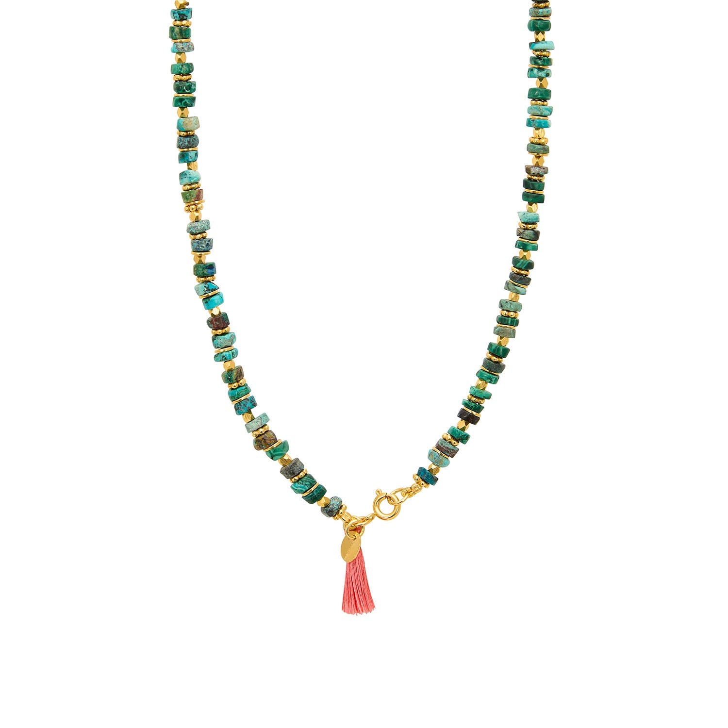 Mala stone necklace, a mixture of chrysocolla stones with small nuts and small balls in a brass base gilded with fine 1 micron and 18 carat gold, all finished with a pretty pink pompom.