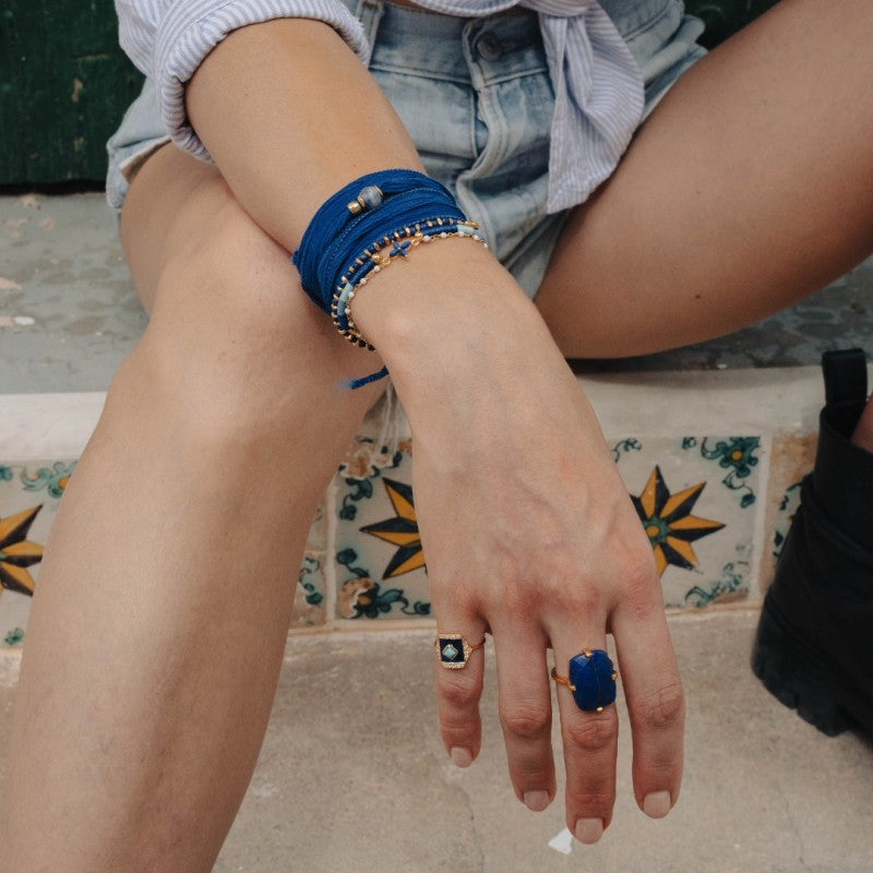 Rectangular ring, one of the Une a Une must haves, a ring on a brass base gilded with fine 18 carat 3 micron gold, and its lapis lazuli stone. Elegance and sobriety.
