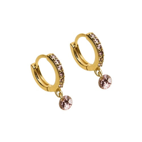 Hoop earrings on a brass base gilded with 18-carat 1 micron fine gold, with small colored zircons, a 4mm rhodolite-colored tassel stone.