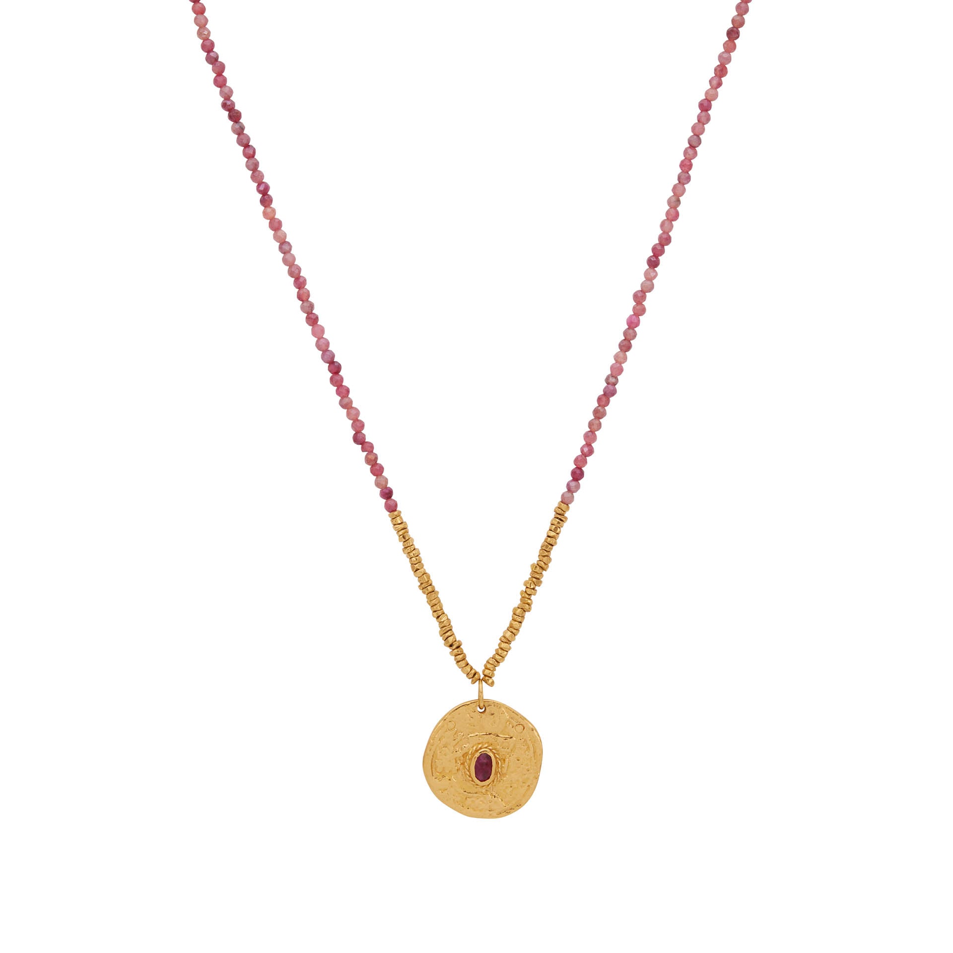 Succumb to the sophistication and sensuality of the Artémis Long necklace. This refined long necklace is distinguished by its sublime gradient of ruby ??silimanite stones and a brass medallion gilded with fine 18 carat 1 micron gold with a diameter of 2cm. In addition, a ruby ??cabochon , set on the medal, completes the brilliance and sophistication of this jewel. Perfect for a chic and vibrant bohemian look, it illuminates your neckline with a touch of passionate red light and timeless elegance.