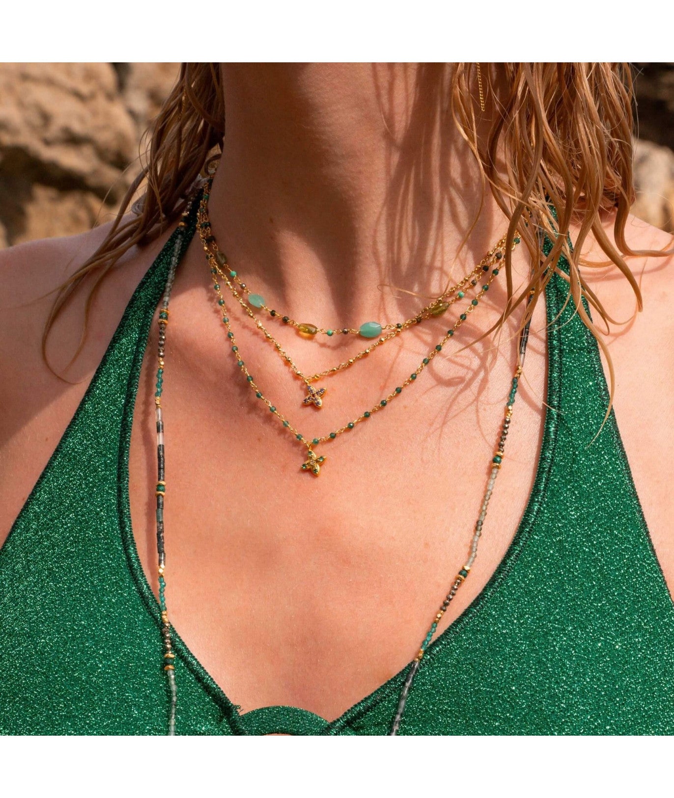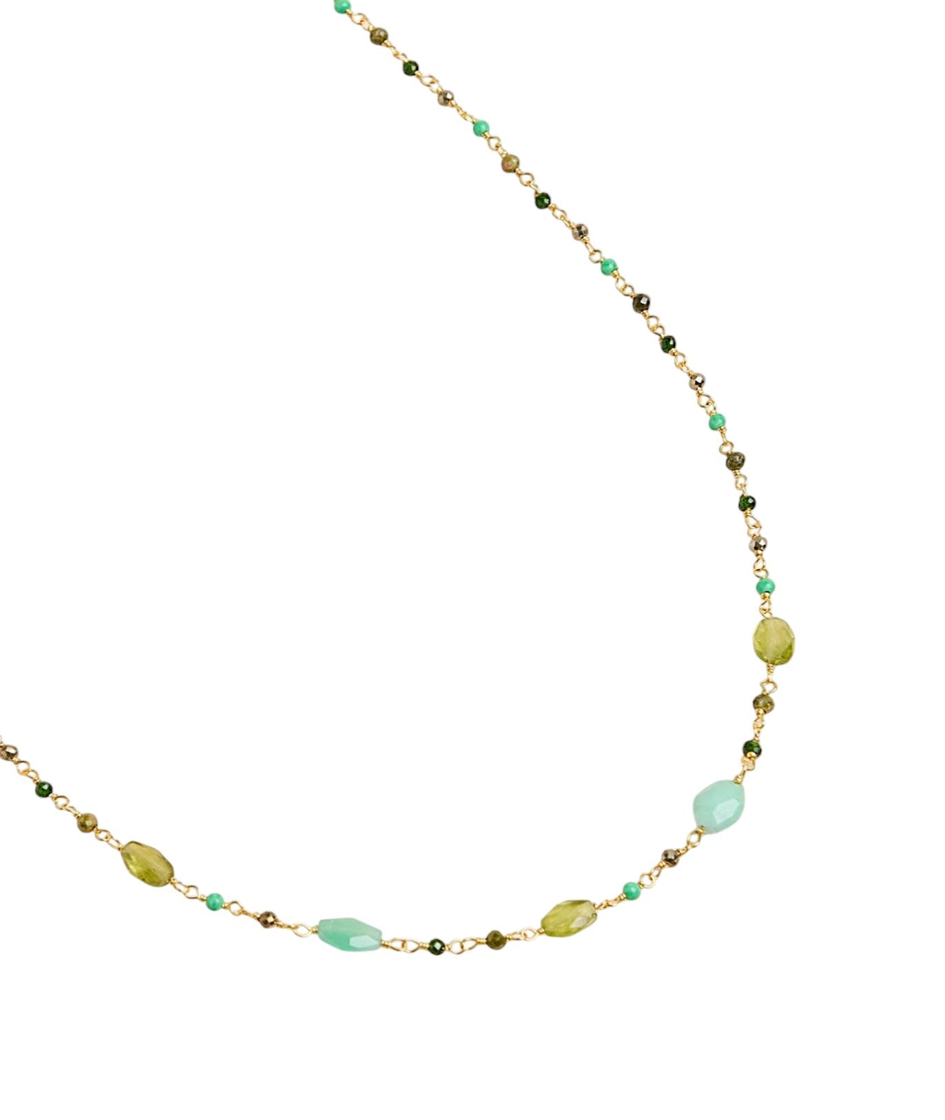 The Mumbai necklace is a refined and elegant piece of jewelry, inspired by the Indian city. It is composed of a chain in shades of green, with stones such as pyrite , unakite, beryl and chrysoprase , which gives it a chic and sophisticated style. The chain is made of brass base, gilded with 18-carat 1 micron fine gold. The necklace is also adorned with oval chrysoprase and peridot stones . These semi-precious stones symbolize joy, prosperity and health.