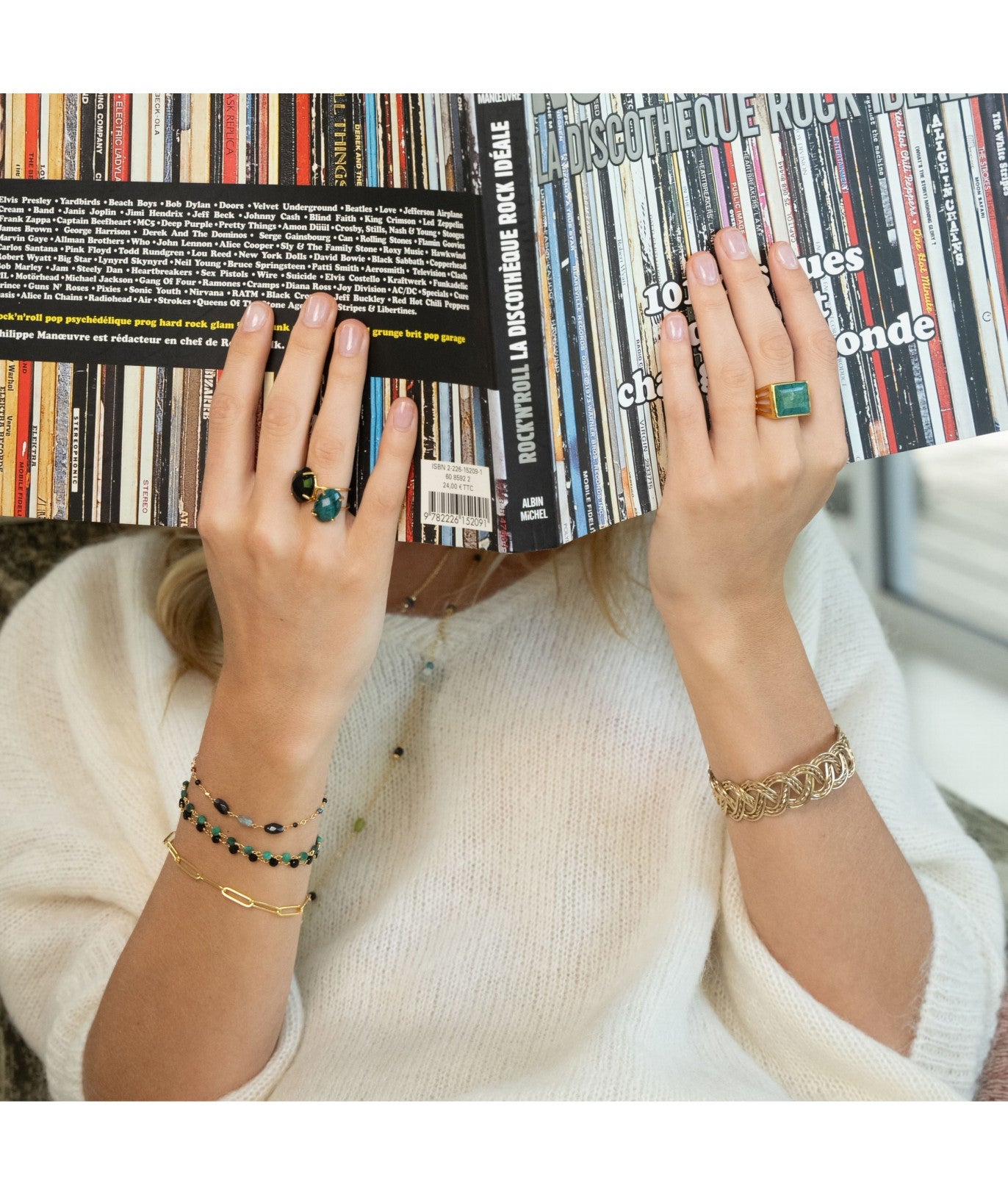 The Mumbai bracelet is a refined and elegant piece of jewelry, inspired by the Indian city. It is composed of a chain in shades of green adorned with peridot and emerald beryl stones, giving it a chic and sophisticated style. The chain is made of brass, gilded with 1 micron 18-carat fine gold. The bracelet is also adorned with small hematite, pyrite, and chrysoprase-colored agate stones.