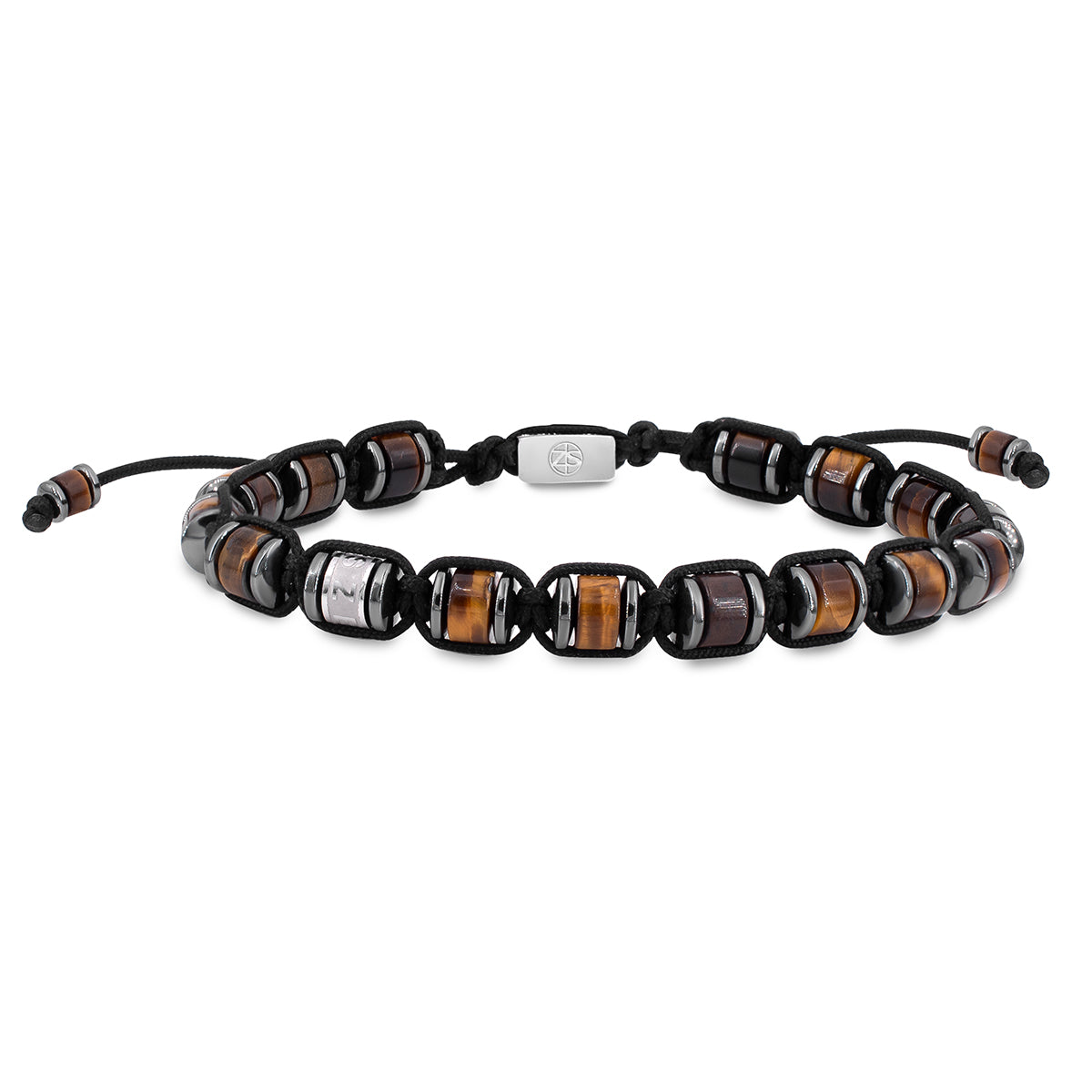 This bracelet is inspired by the 30's Art Deco musical venue Troxy, and conveys a similar luxurious midnight atmosphere. Finely braided Tiger Eye beads are paired with charcoal grey Hematite discs and kept in place by a Z|S branded 316L Stainless Steel cylinder, placed asymmetrically. Its adjustable sliding knot enables the perfect fit for any wrist.