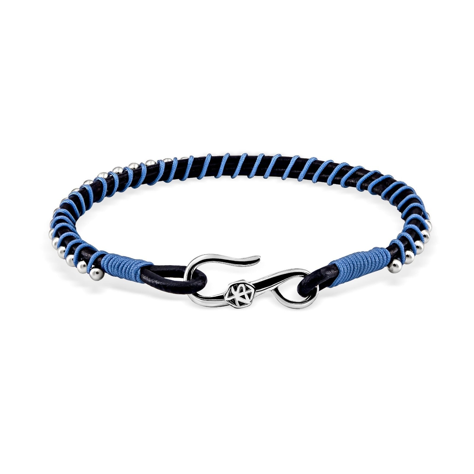 Bracelet GALHAUBAN BL.LB in graphic black genuine Italian leather, handcrafted with an elaborated technical braiding of steel beads and techno-rope on top in light blue color. Comes with a perfectly fitting Stainless Steel ZS hook clasp, easy to put on and off.