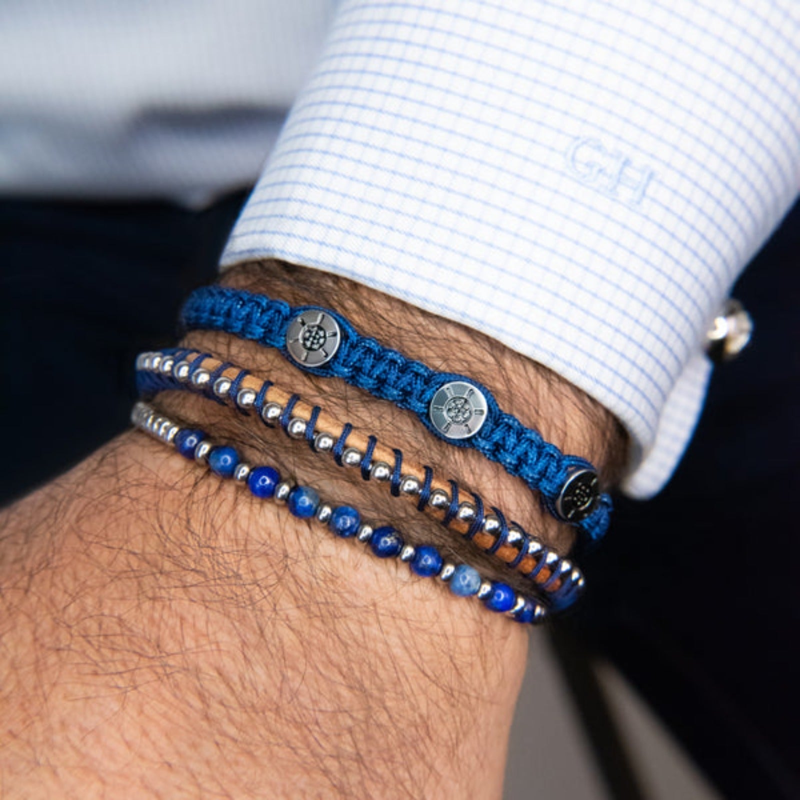 Bracelet GALHAUBAN NA.AB in natural genuine Italian leather, handcrafted with an elaborated technical braiding of steel beads and techno-rope on top in marine blue color. Comes with a perfectly fitting Stainless Steel ZS hook clasp, easy to put on and off.